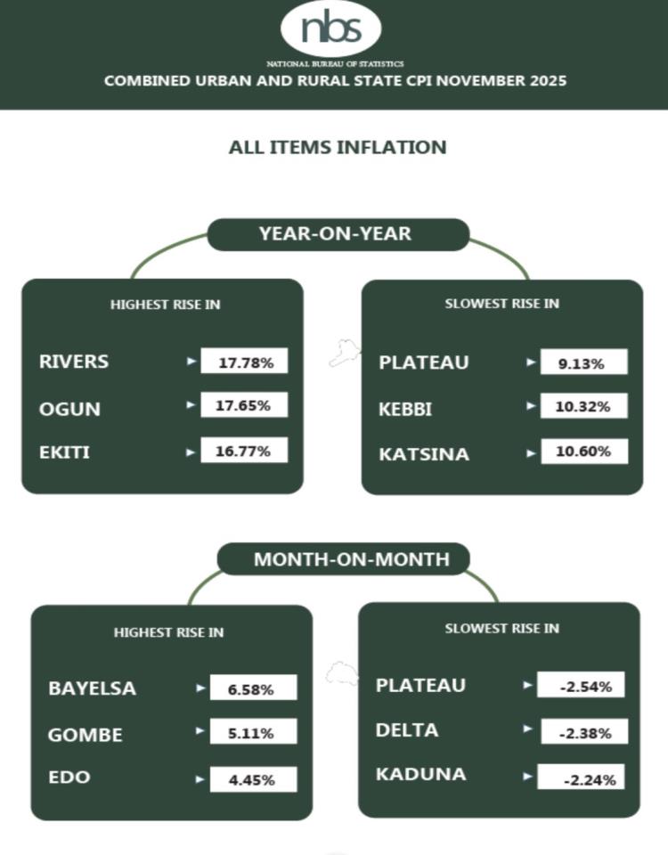 In November 2025, the Headline inflation rate eased to 14.45% relative to the October 2025 headline inflation rate of 16.05%. On a month-on-month basis, the Headline inflation rate in November 2025 was 1.22%, which was 0.29% higher than the rate recorded in October 2025 (0.93%). On a month-on-month basis, the Food inflation rate in November 2025 was 1.13%, up by 1.5% compared to October 2025 (-0.37%). Read the November 2025 CPI Report here: