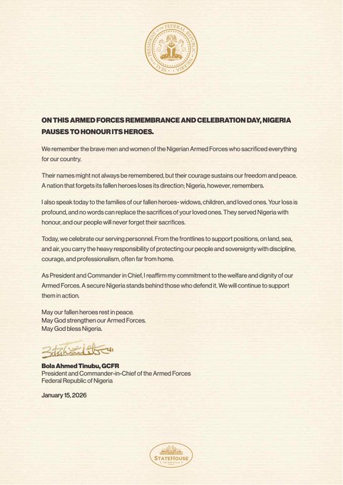 On this Armed Forces Remembrance and Celebration Day, Nigeria pauses to honour its heroes. We remember the brave men and women of the Nigerian Armed Forces who sacrificed everything for our country. Their names might not always be remembered, but their courage sustains our freedom and peace. A nation that forgets its fallen heroes loses its direction; Nigeria, however, remembers. I also speak today to the families of our fallen heroes- widows, children, and loved ones. Your loss is profound, and no words can replace the sacrifices of your loved ones. They served Nigeria with honour, ...