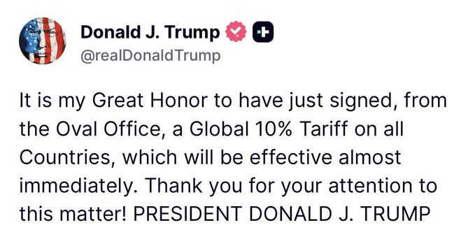 President Donald J. Trump imposes a 10% global tariff on all countries.