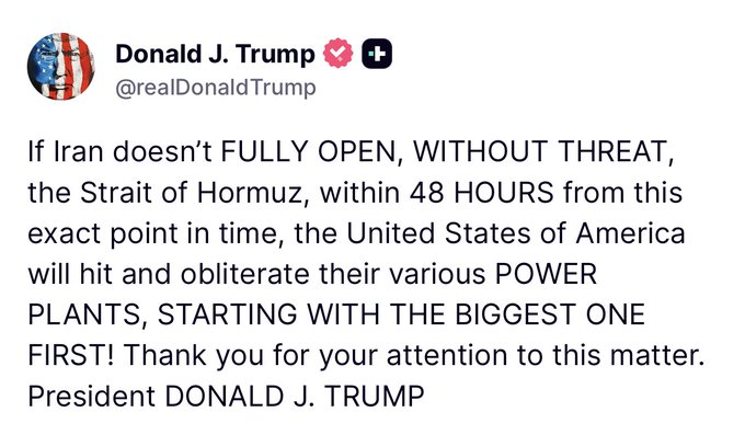 BREAKING: Iran warns it will target US and Israel‑linked energy and IT infrastructure, along with desalination plants in the region if its power plants are hit, following Trump’s threat to strike Iranian plants over the Strait of Hormuz. 🔴 LIVE updates: