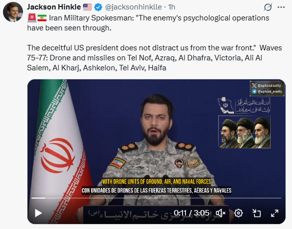Iran Military Spokesman: "The enemy's psychological operations have been seen through. The deceitful US president does not distract us from the war front." Waves 75-77: Drone and missiles on Tel Nof, Azraq, Al Dhafra, Victoria, Ali Al Salem, Al Kharj, Ashkelon, Tel Aviv, Haifa