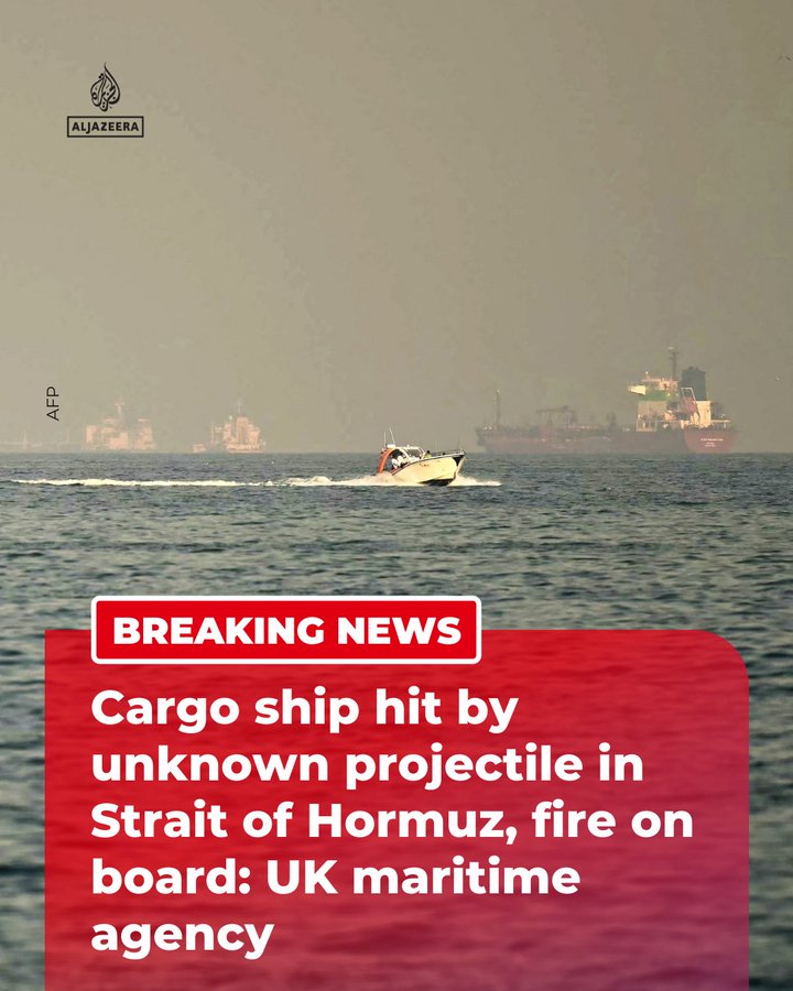 BREAKING: A cargo ship has been hit by an unidentified projectile in the Strait of Hormuz, sparking a fire on board, according to the UK Maritime Trade Operations Centre (UKMTO).
